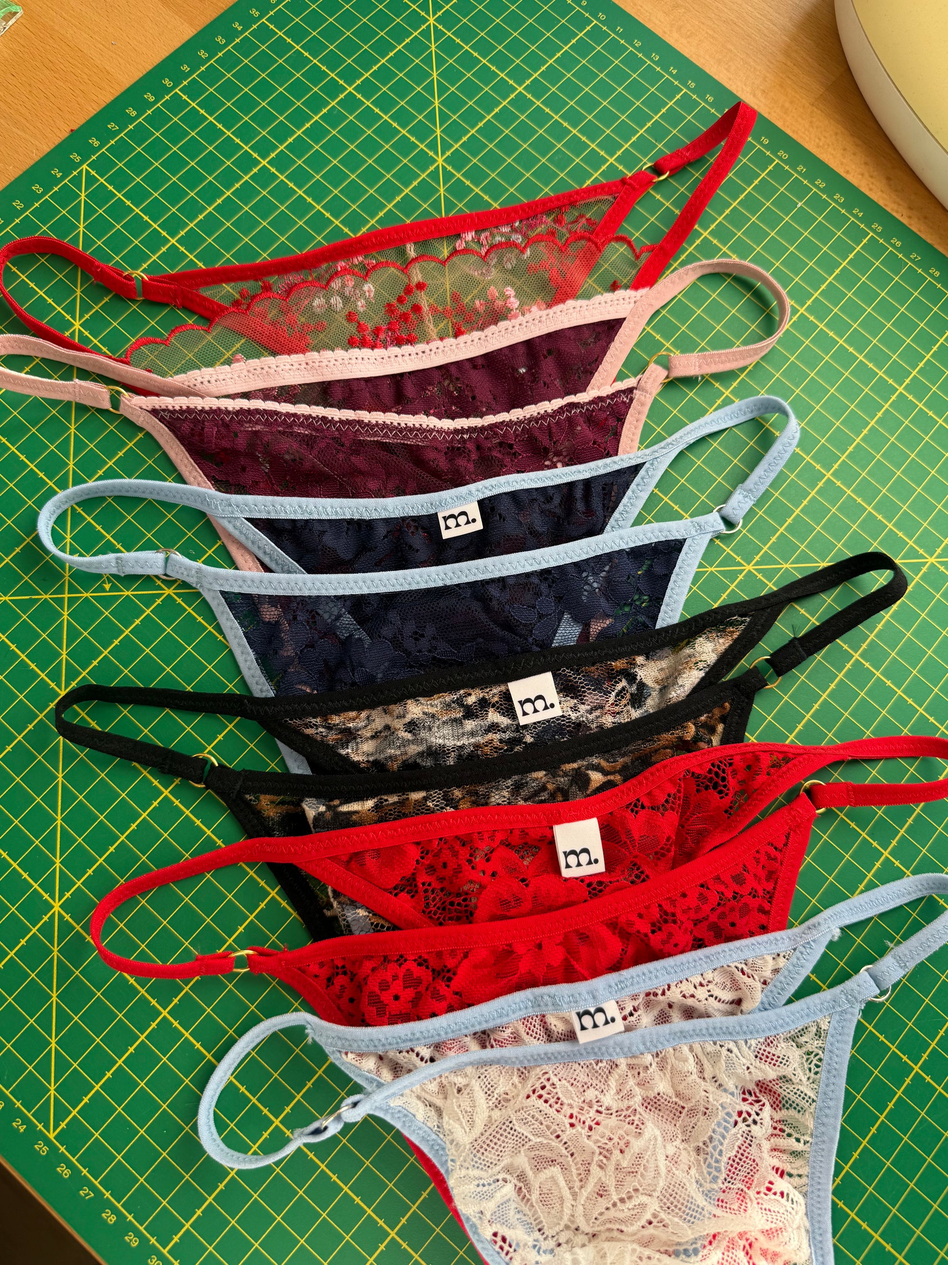 Découvrez le string brésilien, une coupe confortable et flatteuse qui allie féminité et praticité, parfait pour compléter votre lingerie cousue main.